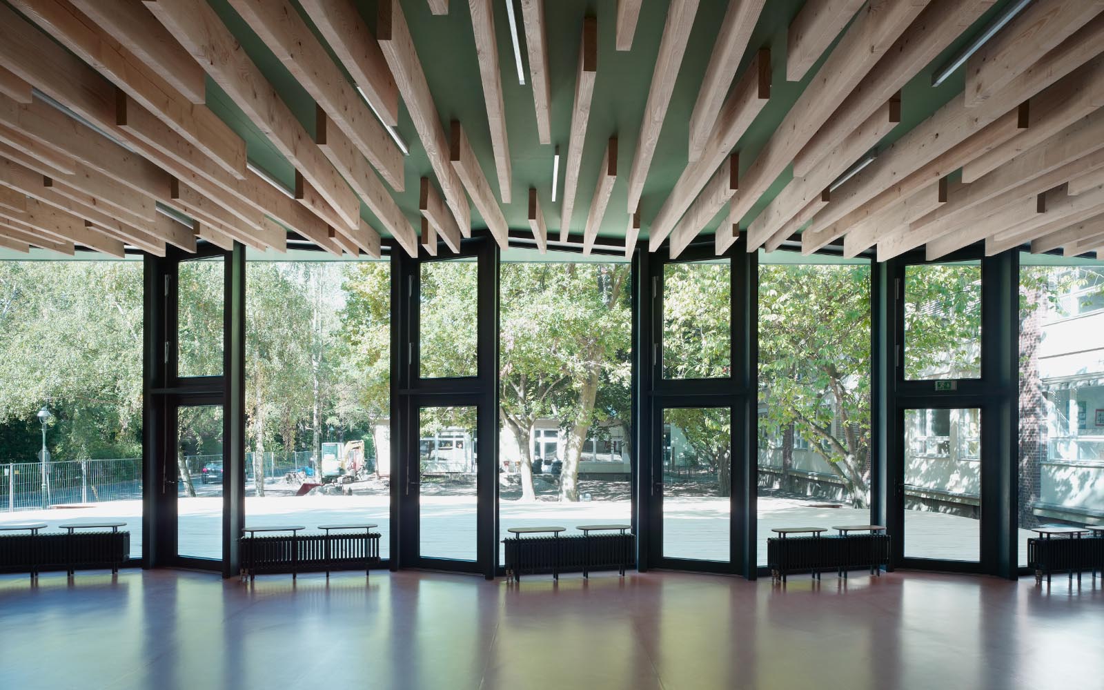 Designed to complete the school's original windmill-shaped main building by adding a “fourth sail”, the new canteen showcases the typology of the green city by allowing for the parklike character of the plot to extend into the interior space. The exposed, filigree wooden beams of the roof- and wall-bearing structure make strong reference to the building's position underneath the treetops and can be construed as forming another “tree crown”.