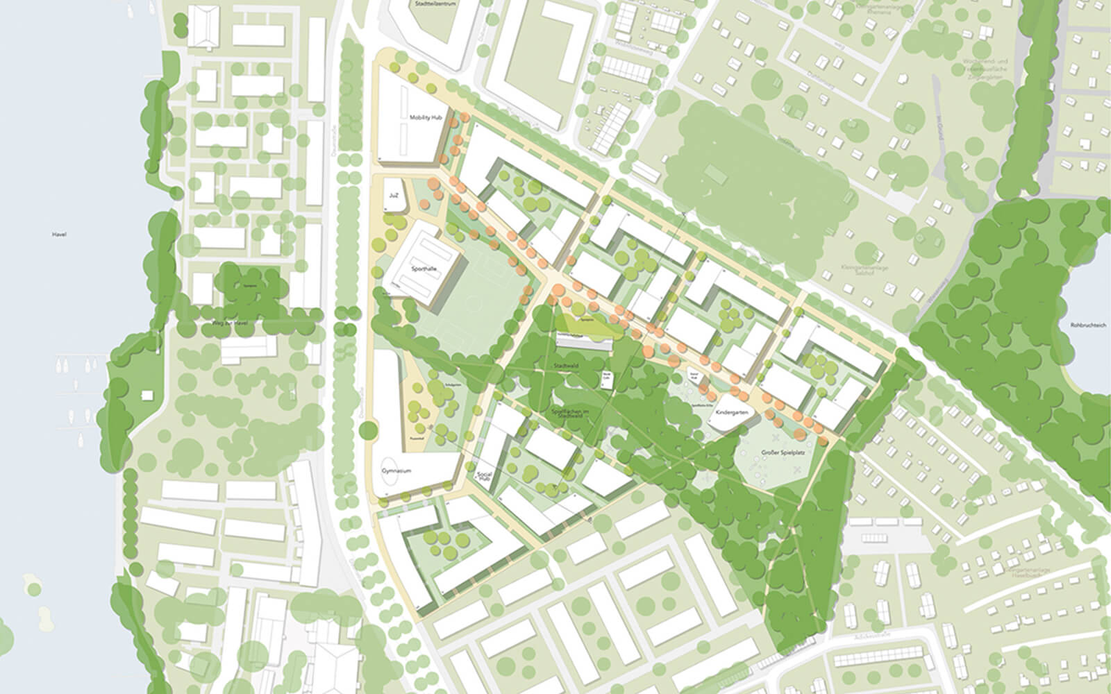 Der zentral gelegene Stadtwald wird um öffentliche und gemeinschaftliche Nutzungen außerhalb des geschützten Bereiches ergänzt und ist grüner Mittelpunkt des neuen Quartiers. Hier laufen alle Wege zusammen. Denkmalgeschützte Gebäude, Kindergarten und Freizeitnutzungen befinden sind in „Lichtungen“ unter Bäumen. Jedes Baufeld bekommt eine Adresse am Grün, die Havel ist nicht weit.