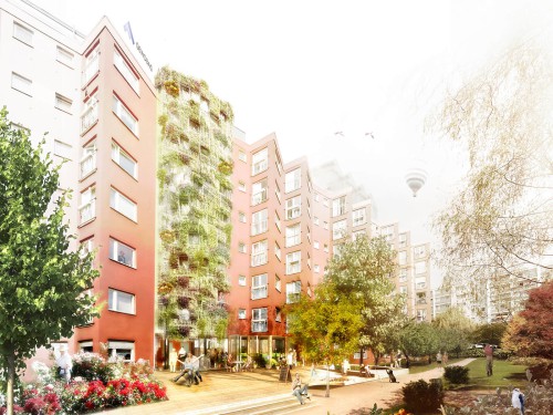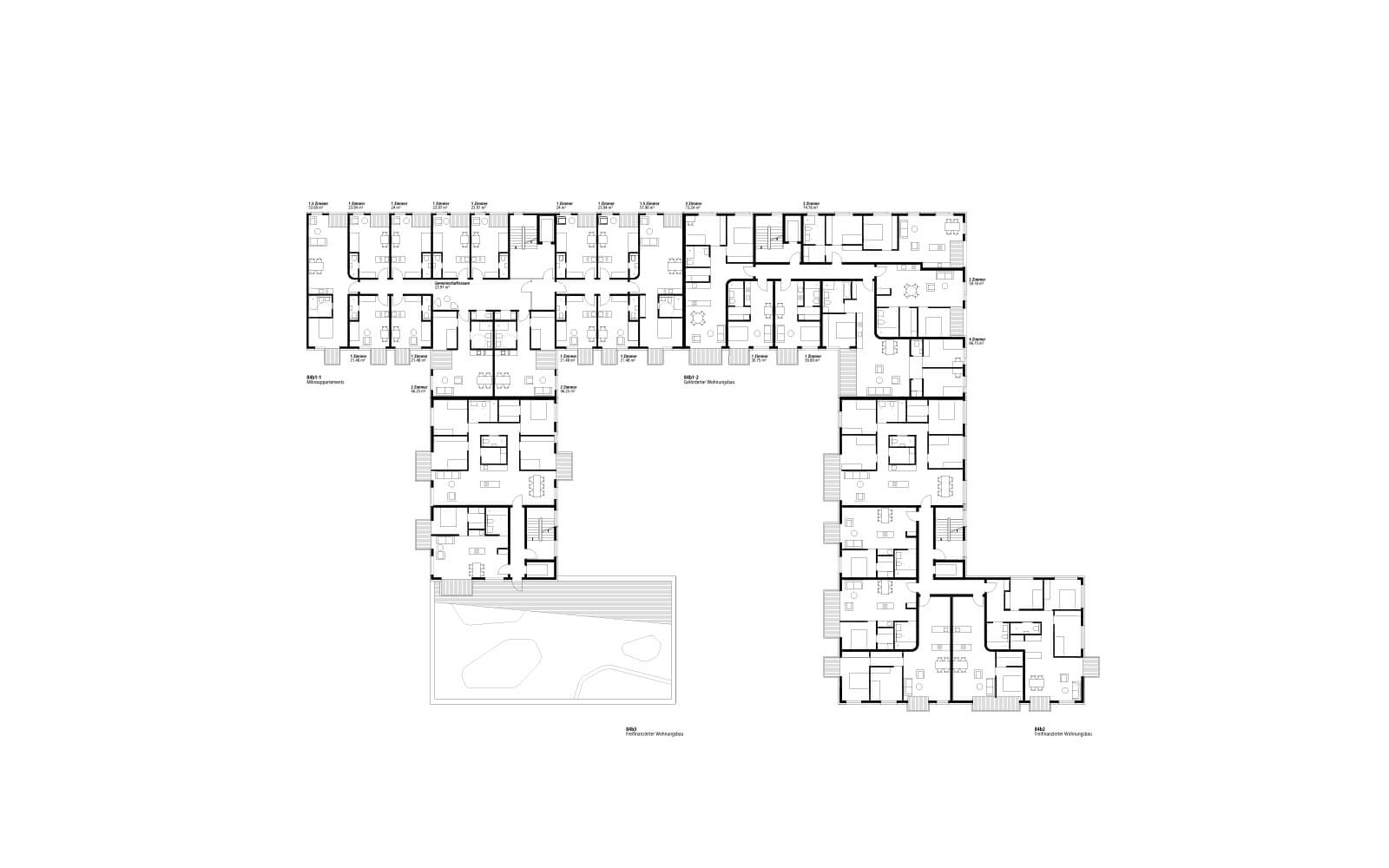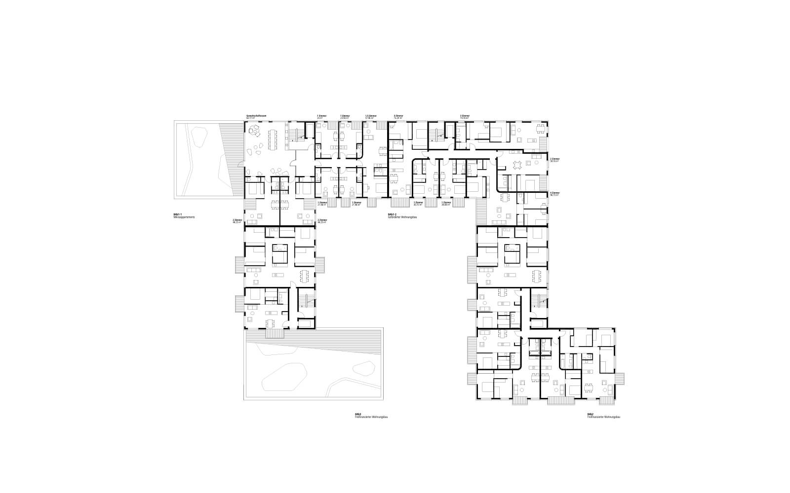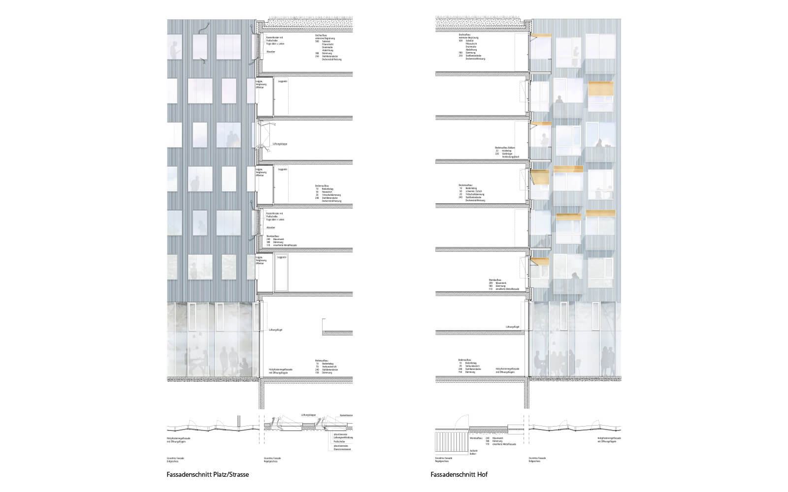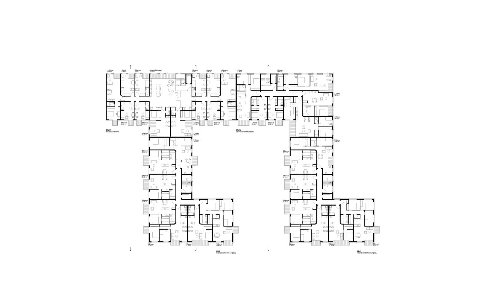 The key of use follows the stipulations of the award, the individual areas of use of the living and working areas flow into each other in part, this image is also recognisable within the façade, without the different financing models becoming concretely visible. The building is generally accessed via a spacious two-storey foyer with letterboxes etc. connected to the façade. The stairwells, which have a stairwell, deliberately offer a "certain luxury" of openness and communication. All further developments, especially in the corridors and within the flats, have been minimised; the areas gained allow for generous living spaces with partly panorama-like windows. The load-bearing walls and sanitary lines of the flats, which for economic reasons are sensibly placed one above the other, form meaningful individual types of living space due to the different positions of windows and terraces.
