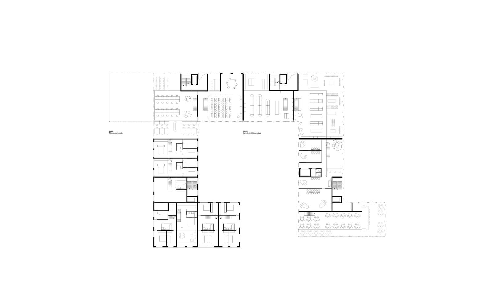 The micro-apartments have a common room on each floor or alternatively alternately on every second floor, which can be accessed via a generously dimensioned staircase and can be used on a specific floor or across floors.