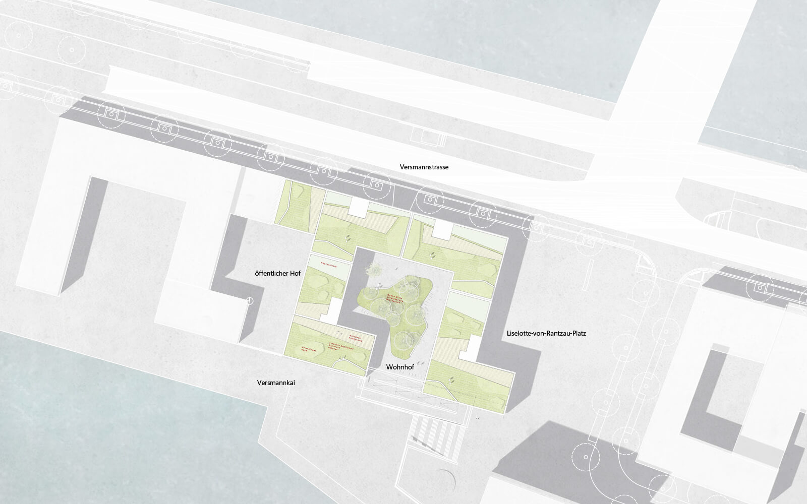 Unser Entwurfskonzept stärkt die formale Reihung ähnlicher Gebäudekubaturen entlang der Promenade am Baakenhafen, das Wohn- und Geschäftshaus versteht sich als ein Baustein der Stadt und überlässt den bereits gesetzten städtebaulich dominanten Abschluss dem zukünftigen Hochhaus der Architekten Murphy & Partners.