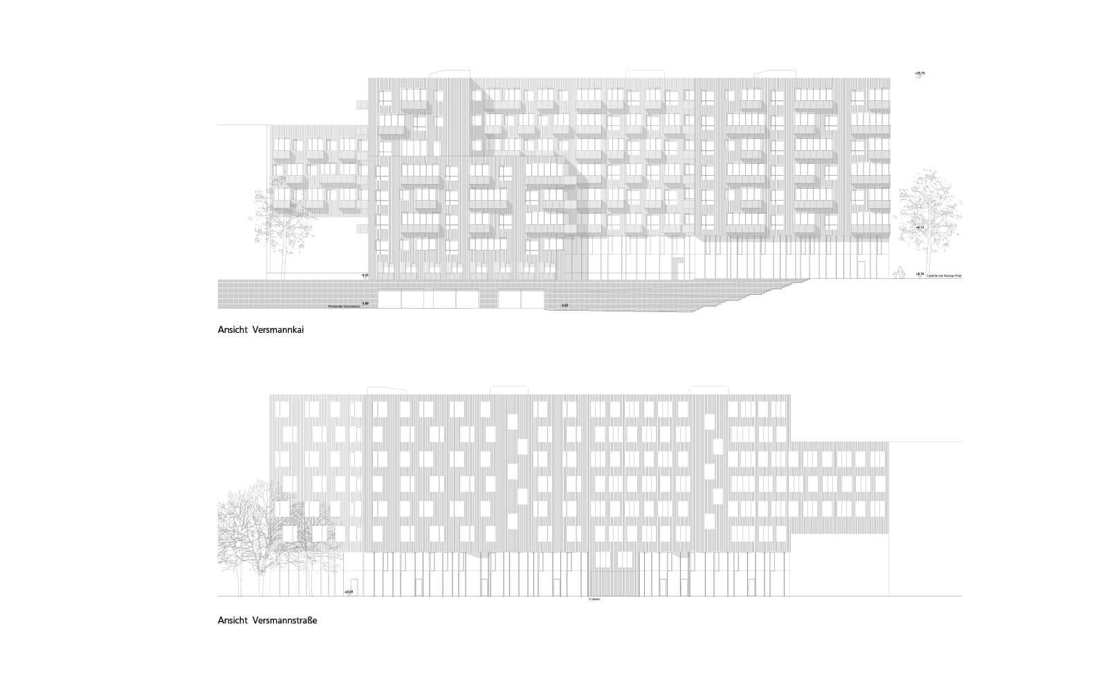 Our design concept strengthens the formal sequence of similar building cubatures along the promenade at Baakenhafen harbour. The residential and commercial building sees itself as a building block of the city and leaves the already set urbanistically dominant conclusion to the future high-rise building by the architects Murphy & Partners.