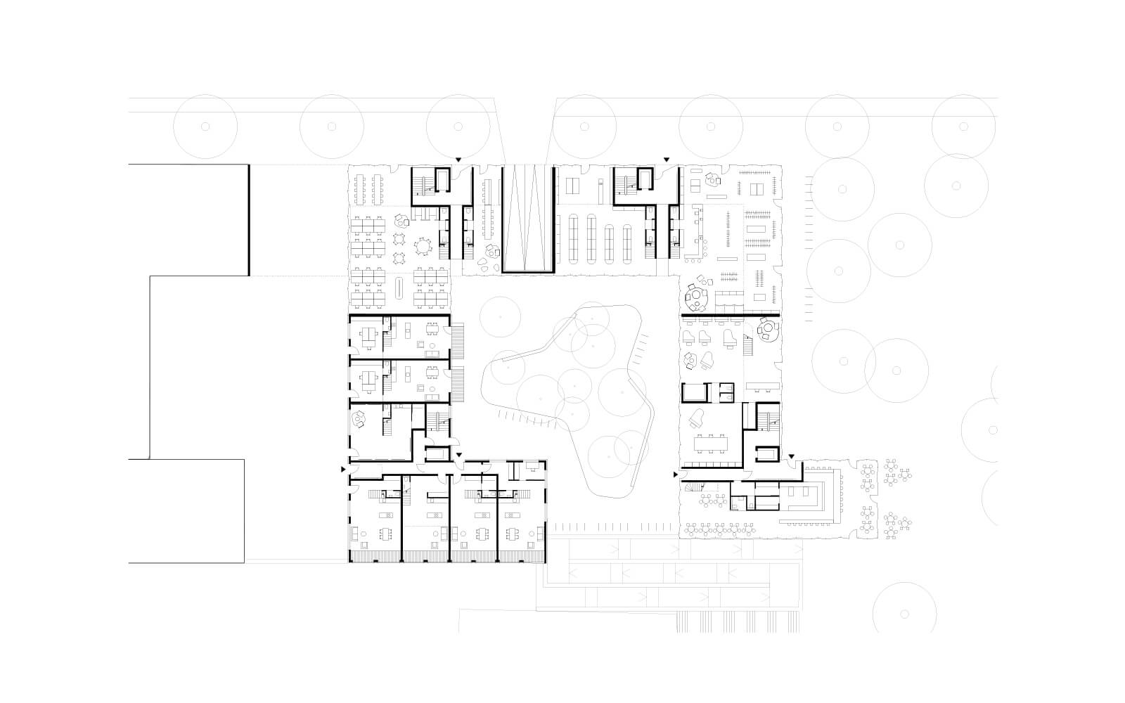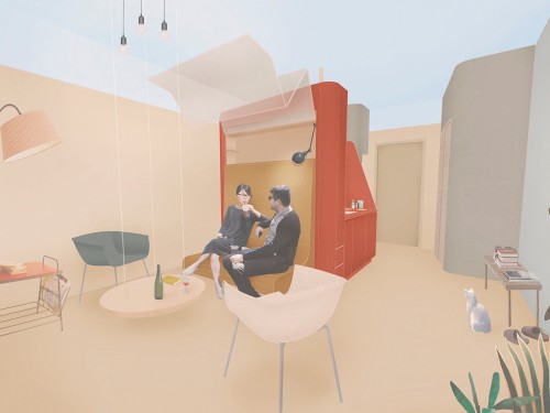 Diese Form des Understatements ermöglicht das Haus von innen heraus zu denken und gleichzeitig mehrdeutige Beziehungen zu den jeweiligen Außenräumen aufzubauen und optimierte Wohn- und Arbeitsgrundrisse für unterschiedlichste Lebensformen zu gewährleisten. Das „in Tuch gehüllte Haus“ bindet souverän und selbstverständlich in das zukünftige Stadtgefüge ein.