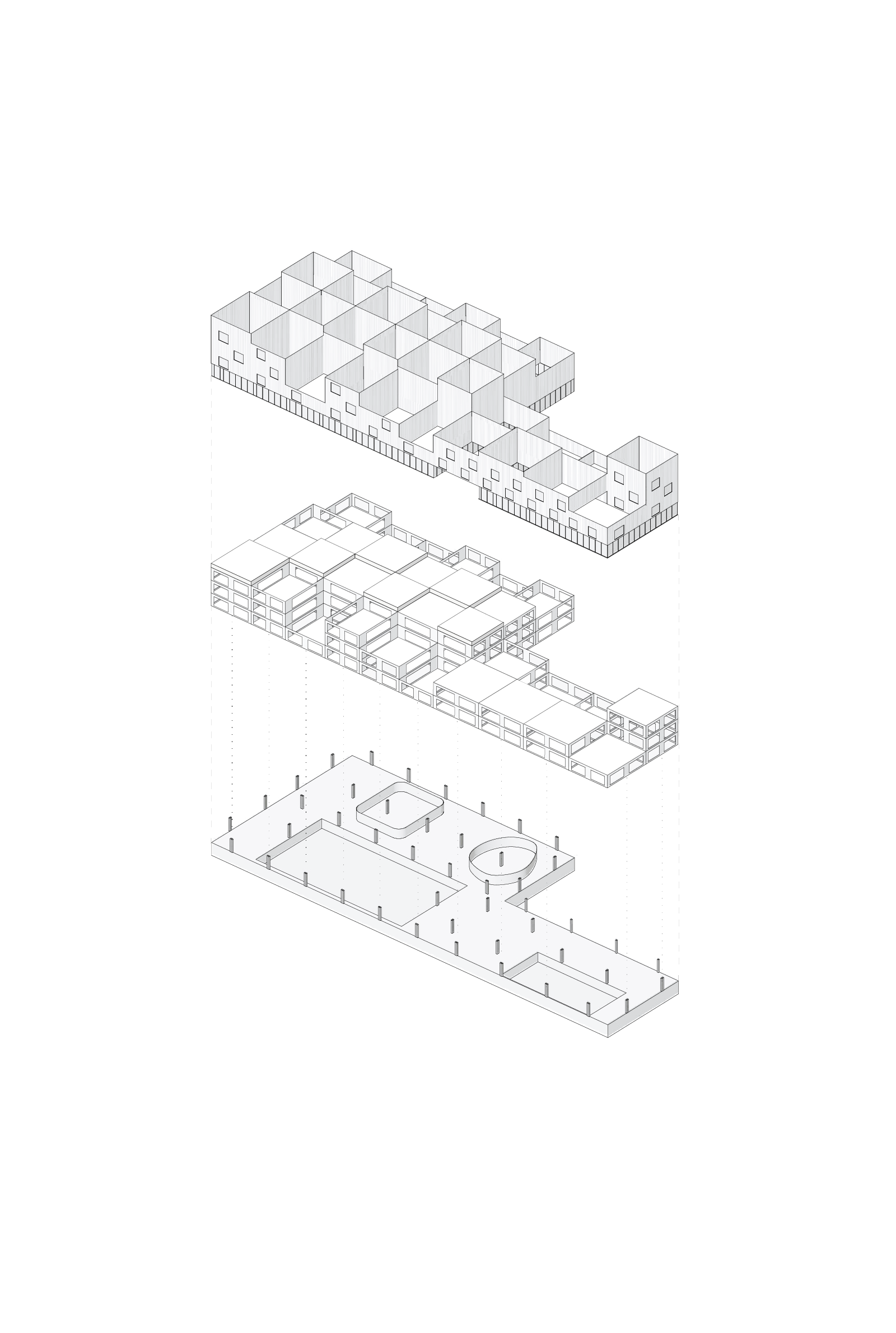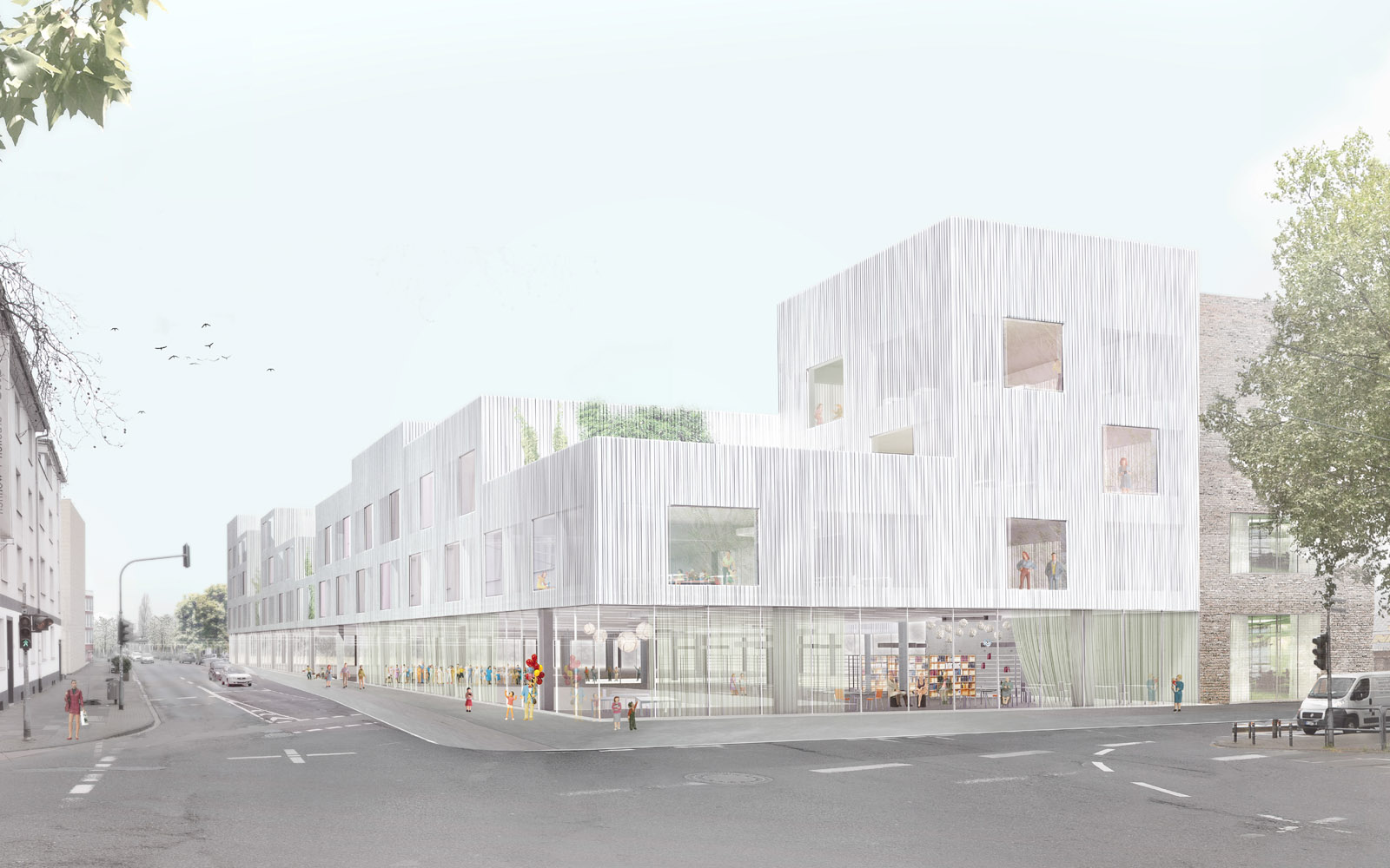 Die für Ehrenfeld typische Heterogenität ist ein Abbild der heterogenen Zusammensetzung der Anwohner und Gewerbetreibenden. Diese Grundlage bildet den Ausgangspunkt für einen Lebens- und Lernort aus städtischen Zimmern, Loggien und Höfen. Die Schule bietet sich als zugehöriges Stadtquartier, als Cluster, im Stadtgefüge von Köln Ehrenfeld an. Dabei wird Schule weniger mit einem Gebäude assoziiert, als vielmehr mit einer Stadtstruktur, in der öffentliche, halböffentliche und private Räume existieren und den Schülerinnen, Schülern und Lehrenden ein vielschichtiges Angebot zur Verfügung stellen. Die Schule ist Abbild und Teil einer heterogenen Stadtgesellschaft.