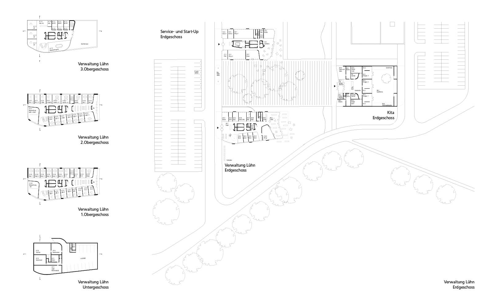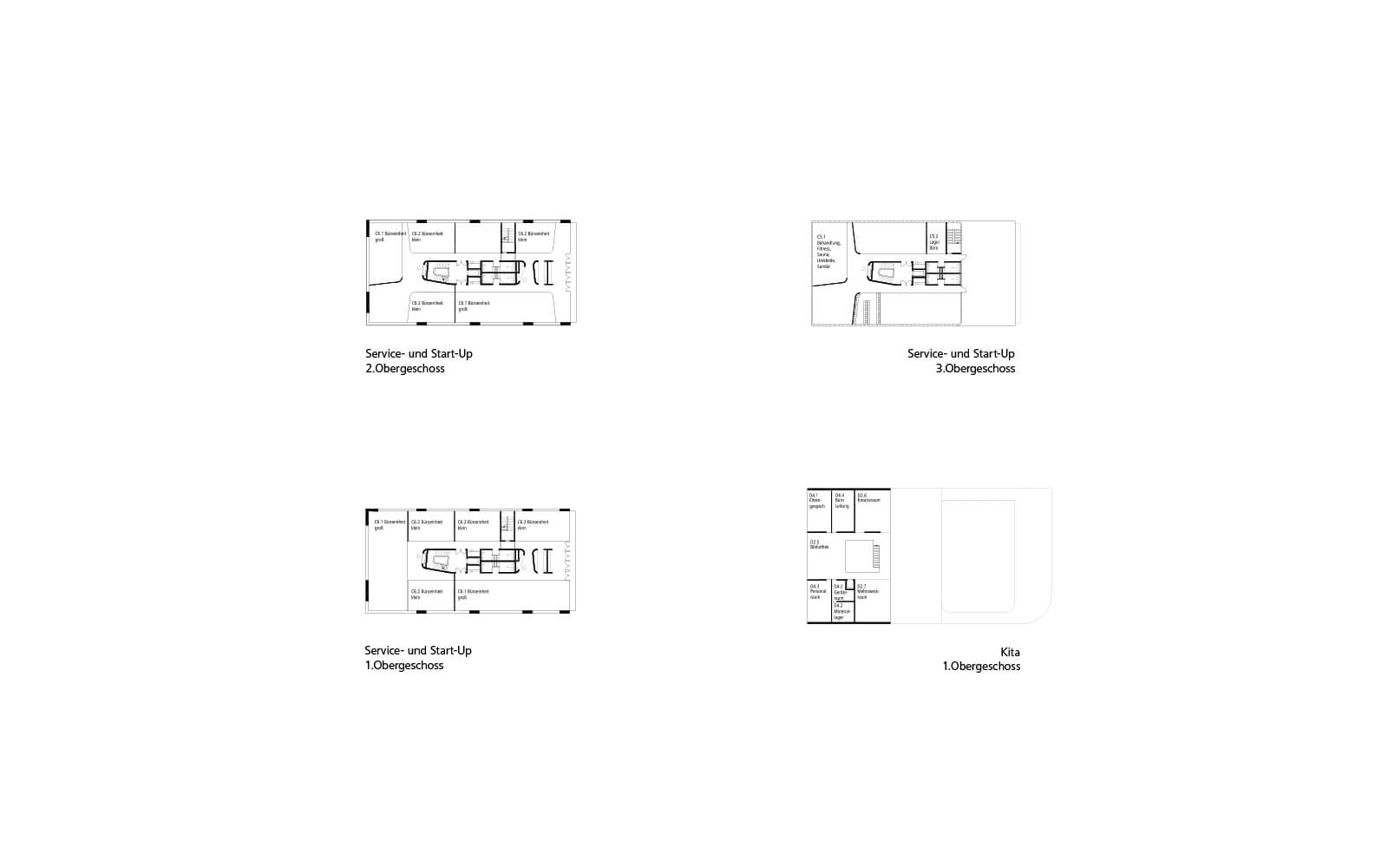 Das Start-Up-Gebäude ermöglicht flexible Büroflächen und eine Cafeteria mit direktem Zugang zum baumbestandenen Südsteg. Der Kindergarten gruppiert sich um einen geschützten Hof. Drei begrünte Plätze gliedern das Gelände und verbinden Gebäude mit dem Park.