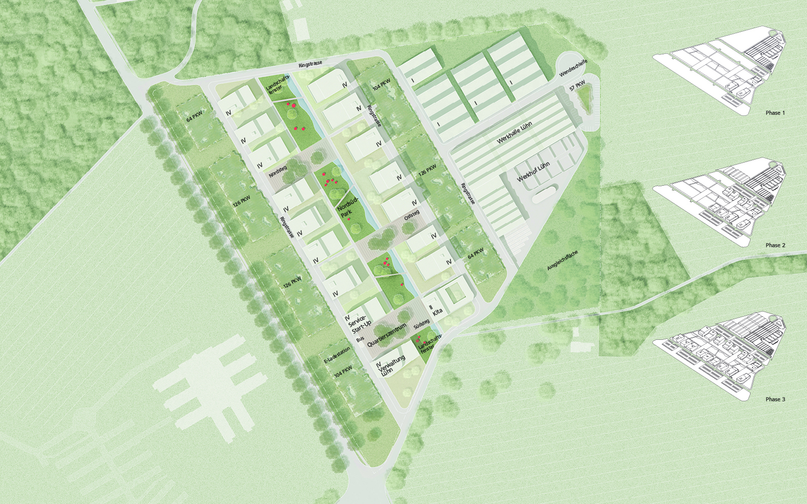 At the southern entrance to Lingen, an innovative space for communication, contemplation, and production is taking shape. A central open space harmonises work and leisure, density and openness. Lühn is creating an ensemble as the first step in a new landscape axis – an inspiring environment that blends technology, ecology, and quality of life.