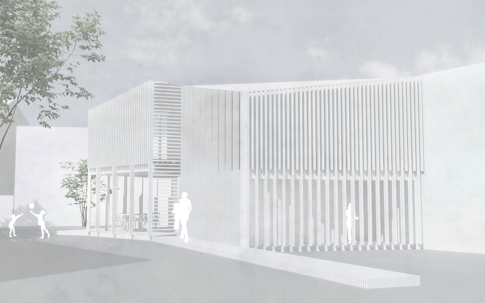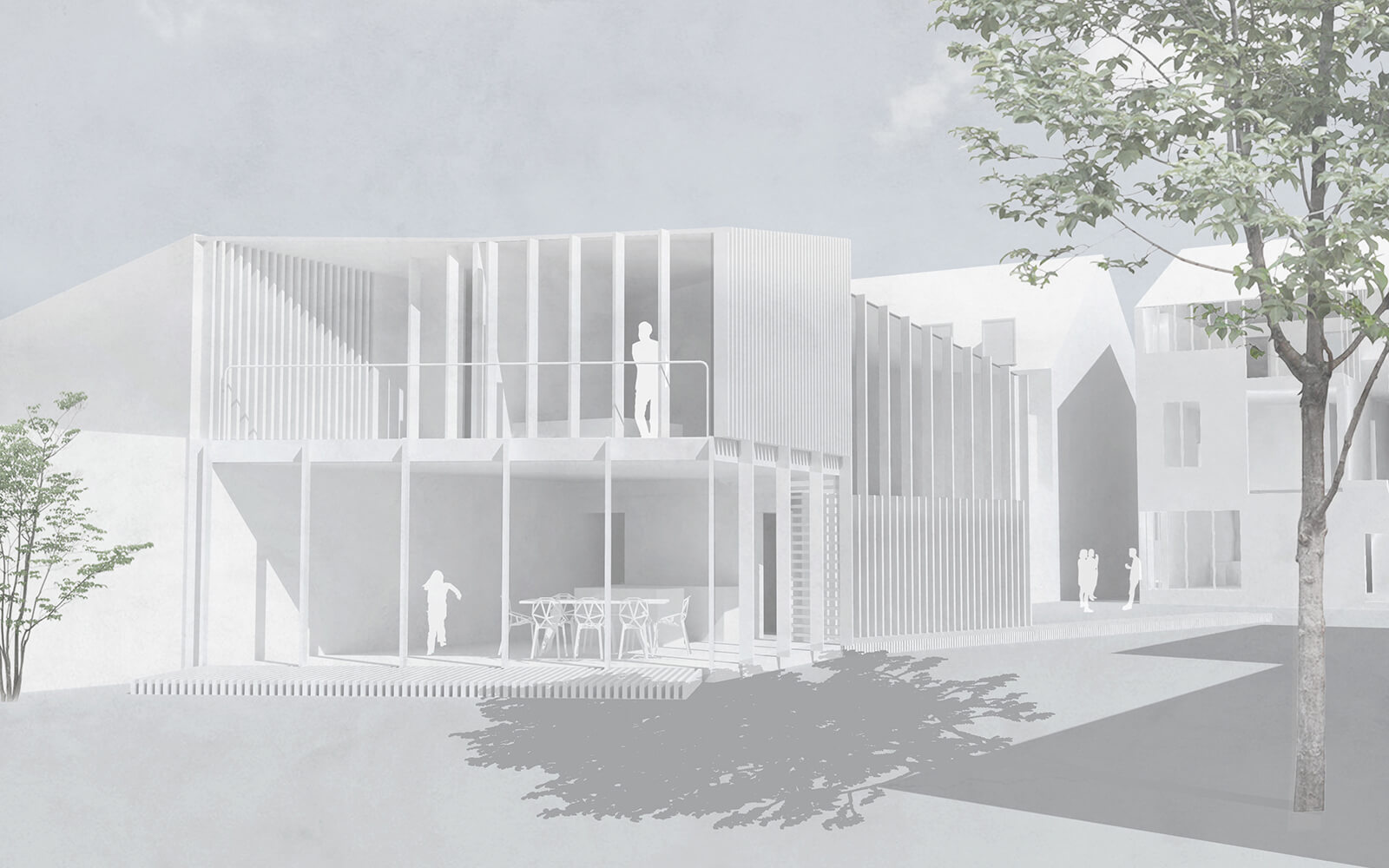 Planning comprises a front building incorporating the existing street-facing development's alignment and depth and offering flexible floor plans, and a single-unit residential and studio house at the back of the plot.