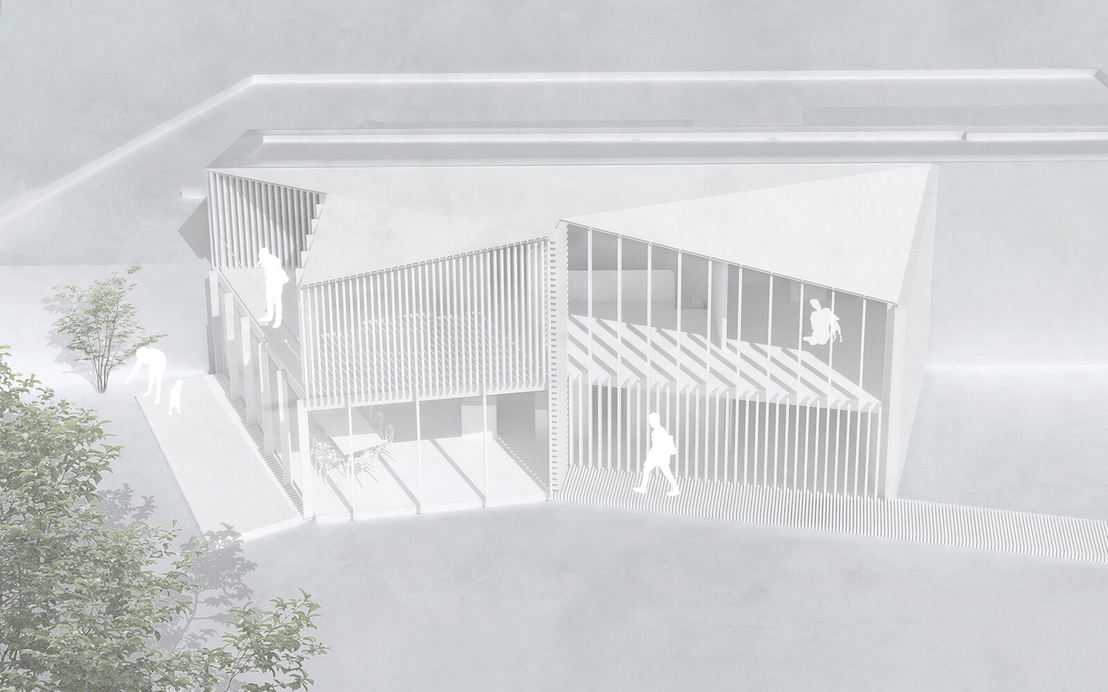 Die Kubatur des Gartenhauses kann als Skalierung der auf einem dreieckigen Blockschema aufbauenden städtebaulichen Topologie verstanden werden, gleichzeitig hilft diese Form, je Nutzungsbereich, verschiedene „Privatheiten“ auszubilden.