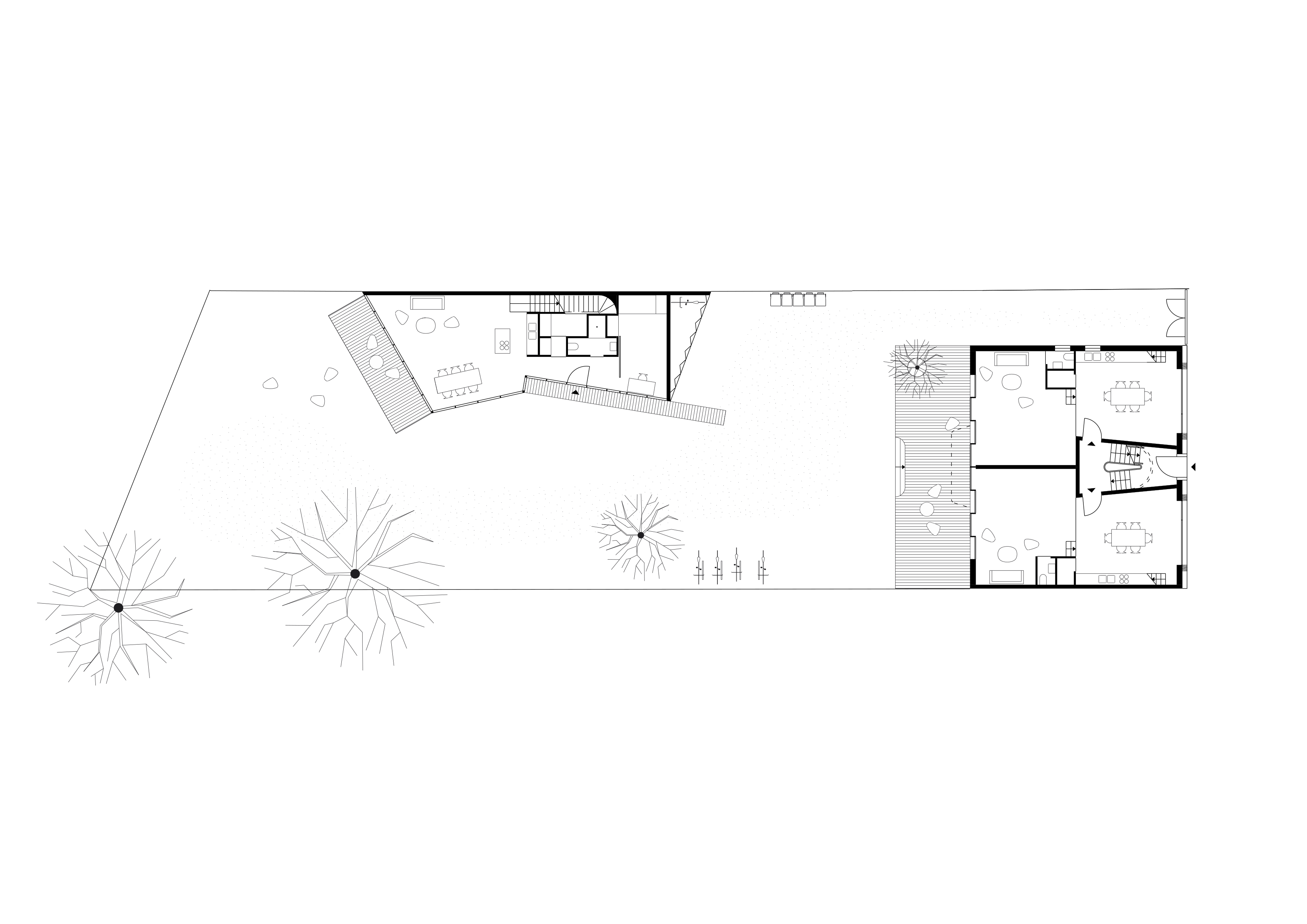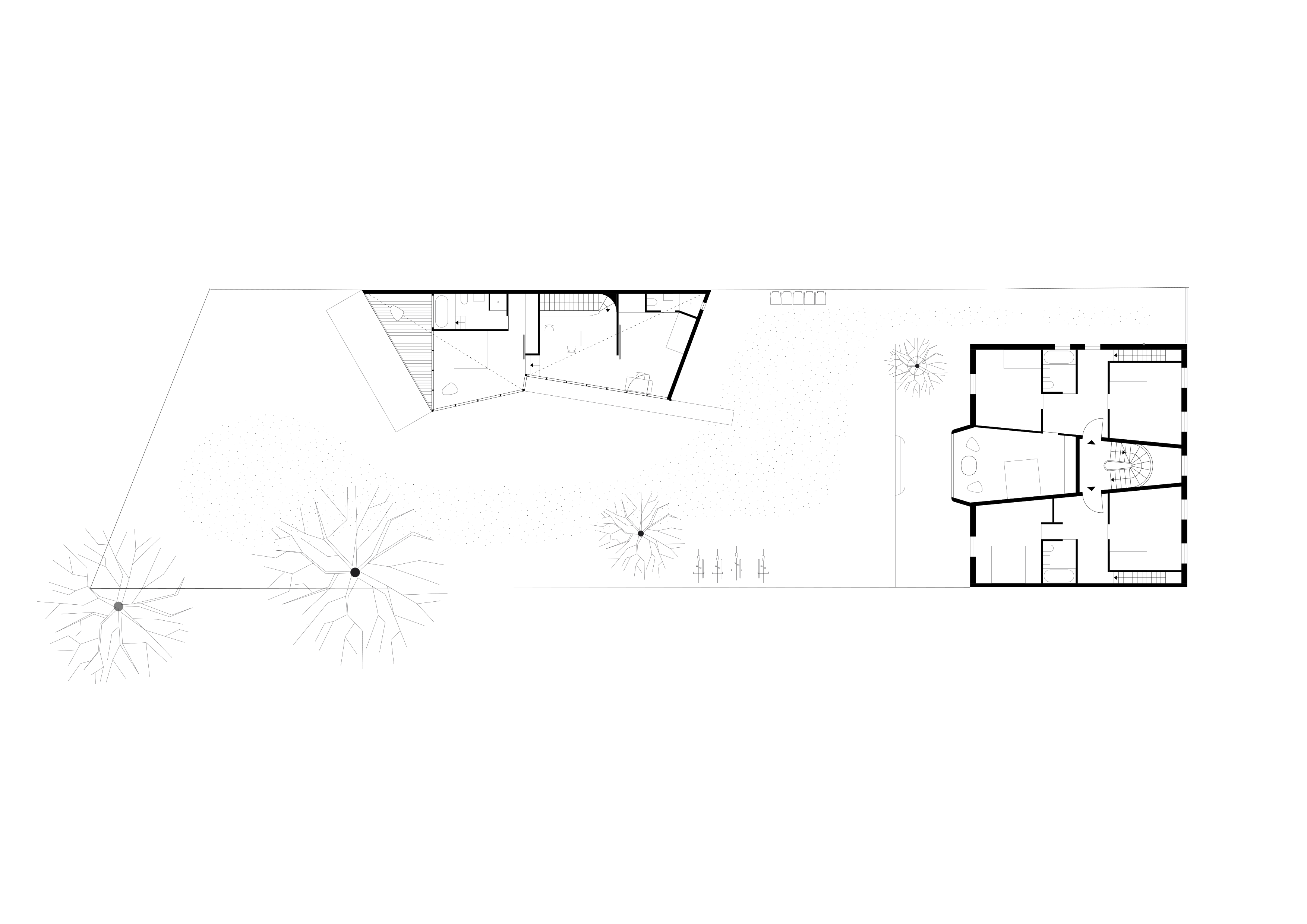The back building's cubature may be construed as scaling an urban topology that takes as its basis a triangular block diagram, the shape of which also helps to create several “private spaces” per unit.