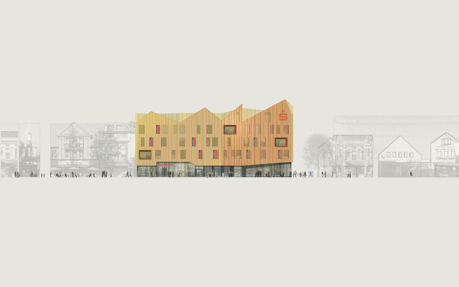 Die Herausforderung besteht darin, innerhalb der bestehenden, gewachsenen, kleinparzellierten Struktur der Mühlenstraße, eine maßstabsgerechte Antwort zu finden, die es schafft, die teilweise divergierenden Ansprüche aus Verwaltungsnutzung und Stadtraum zu einem Gefüge zu verdichten. Gleichzeitig soll den Ansprüchen an ein modernes Stadtleben Rechnung getragen und der Denkmalplatz um ein neues „Gesicht“ bereichert werden. Unser Vorschlag für die Sparkasse LeerWittmund setzt ein beispielhaftes Zeichen wie das Zusammenspiel von historischer Bausubstanz und Moderne gelingen kann.
