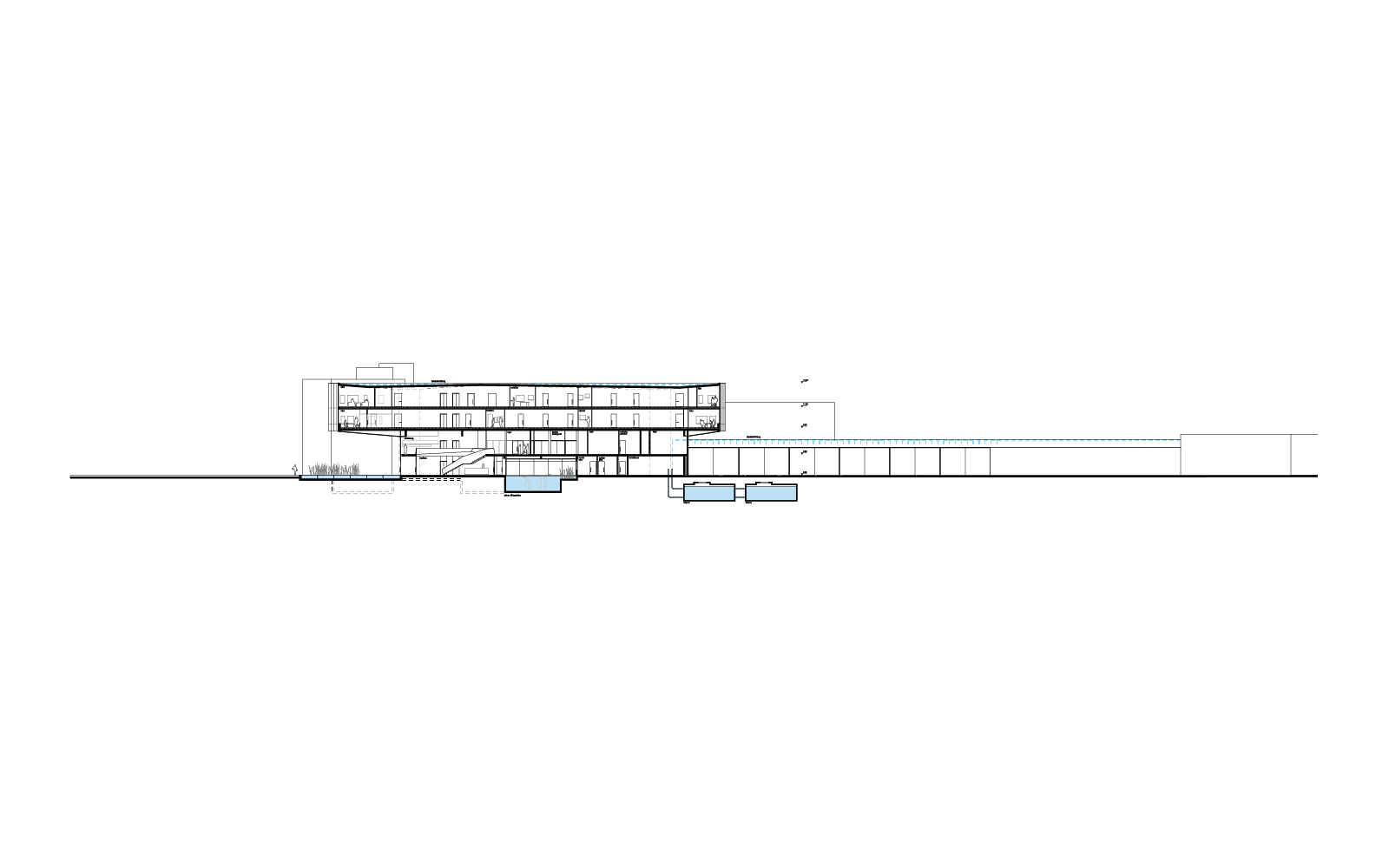 Diesem „Gebäuderücken“ steht die funktionsbezogen gefaltete Nordfassade in Holzbauweise gegenüber, ausgebildet in einem Achsraster von 1,35m, bestehend aus großflächig festverglasten Dreifachisoliergläsern und hochgedämmten Lüftungsklappen zur individuellen Stosslüftung. Die geschlossene Fassade des Erdgeschosses bleibt betonsichtig, die verglasten Teile erhalten eine filigrane Glasfassade.