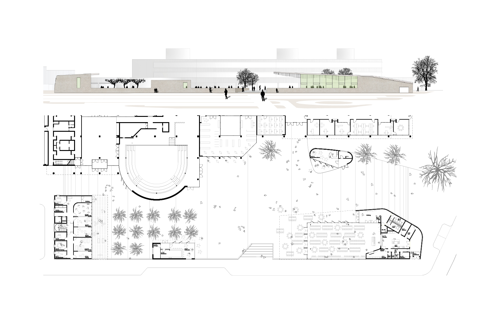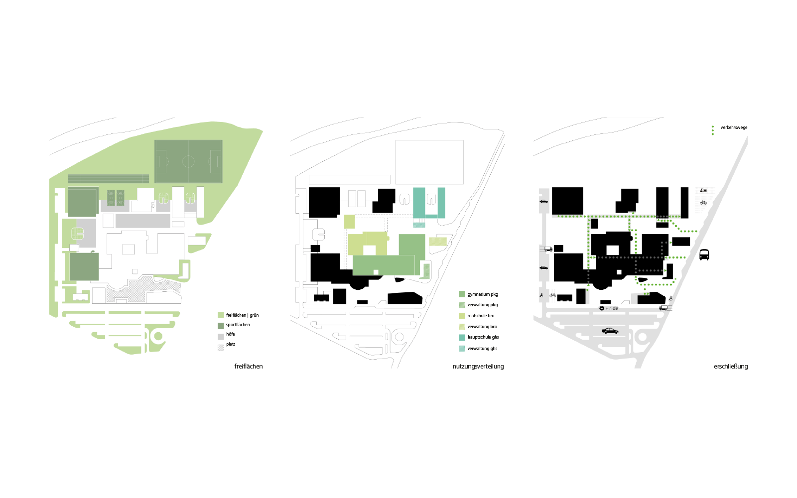 Wir gehen bei unserem Vorschlag von der Idee einer Schule der Schüler aus: sie integriert vielfältige Formen, sich an der Gestaltung und Belebung der Schule zu beteiligen. Ein zentraler Platz beherbergt neben der Mensa verschiedene Ateliers und Schülercafés, als Räume zur Präsentation und für Aktionen. Hier befinden sich die Orte, um einen informellen Gedankenaustausch zwischen Schülern, Lehrern und Gästen zu fördern. Daneben bietet die Schulstadt halböffentliche und private Räume an, in Form von definierten und zugeordneten Freiflächen, die im Zuständigkeitsbereich der jeweiligen Schulteile weitere Räume für individuelle Gestaltungen bereit stellen.