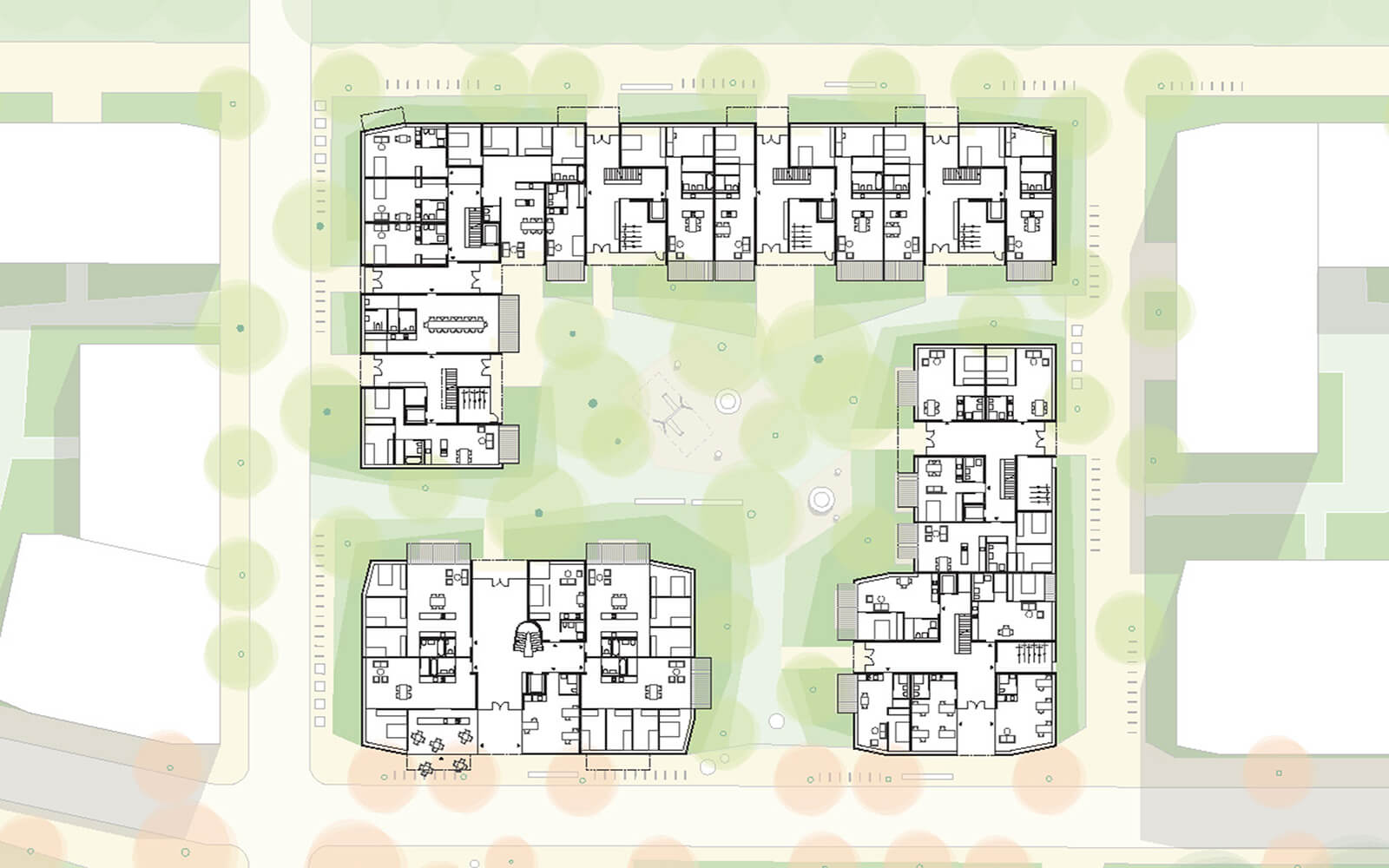 Der zentral gelegene Stadtwald wird um öffentliche und gemeinschaftliche Nutzungen außerhalb des geschützten Bereiches ergänzt und ist grüner Mittelpunkt des neuen Quartiers. Hier laufen alle Wege zusammen. Denkmalgeschützte Gebäude, Kindergarten und Freizeitnutzungen befinden sind in „Lichtungen“ unter Bäumen. Jedes Baufeld bekommt eine Adresse am Grün, die Havel ist nicht weit.